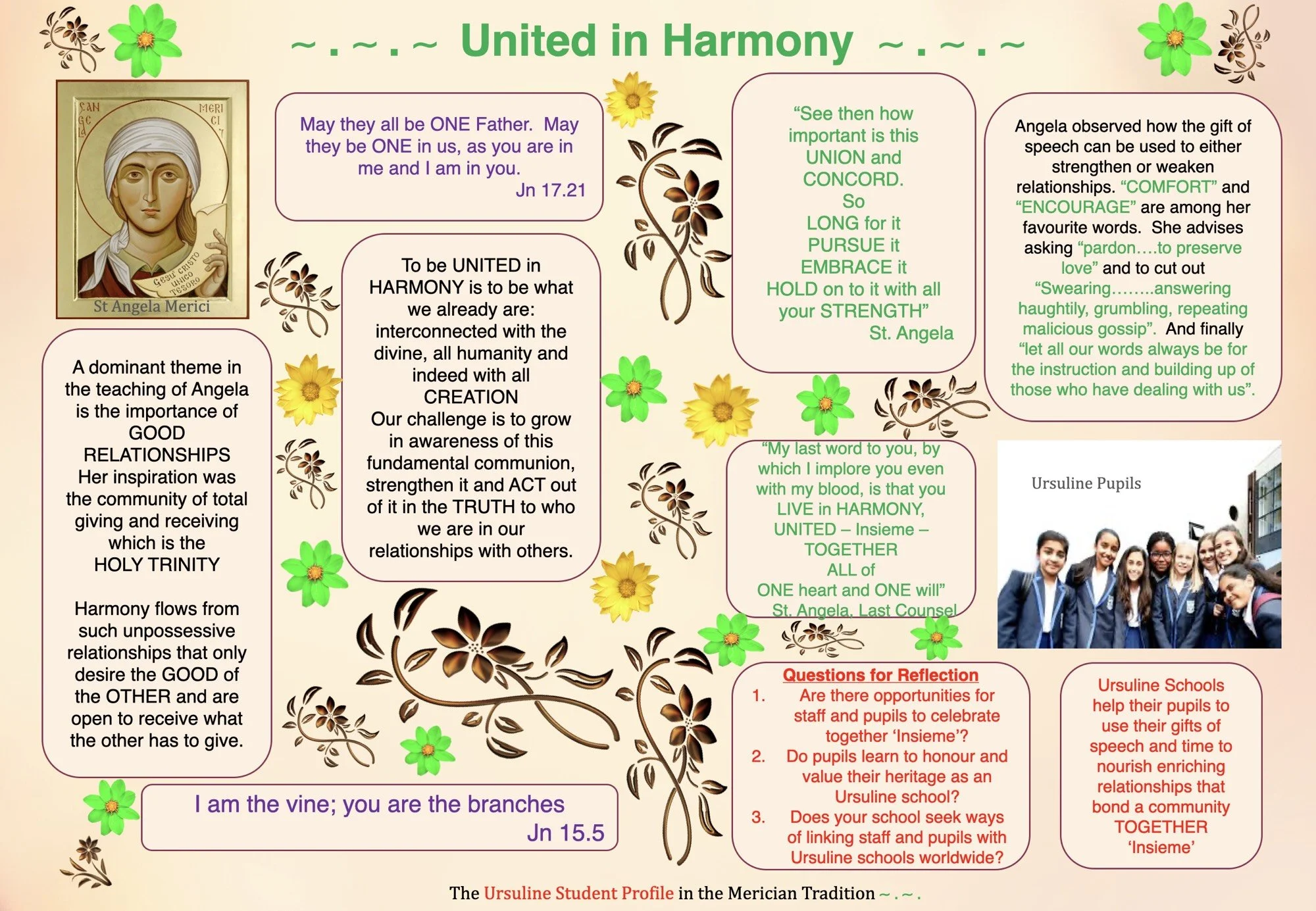 By encouraging them to be united in harmony in their friendships, classes, year groups, school, local and global communities.